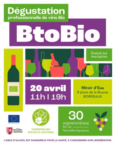 BtoBio est un salon professionnel dédié aux rencontres entre les vignerons Bio de Nouvelle-Aquitaine et l’ensemble des acteurs de la filière vin : CHR, grossistes, importateurs, agents, œnologues et presse. L’ambiance se veut authentique, à la fois professionnelle et conviviale..